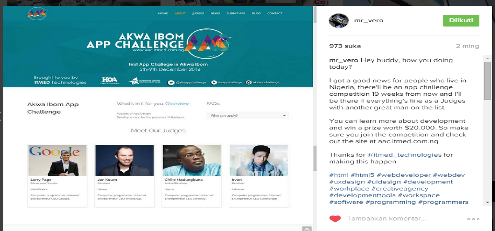 Pasalnya Programmer berusia 20 tahun tersebut akan menjadi juri di salah satu kompetisi di nigeria yang bernama AKWA IBOM APP CHALLENGE.