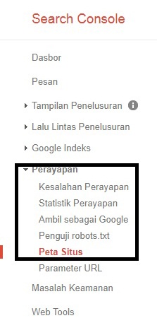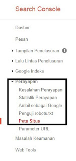 4. pada tampilan berikutnya silahkan soabt klik menu Perayapan dan masuk ke Peta Situs ataupun Sitemap, silahkan lihat gambar berikut.