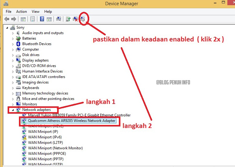 Hal yang paling utama dalam sebuah laptop yaitu driver, driver sendiri disini berfungsi untuk memaksimalkan kinerja driver yang ada, salah satunya driver wireless pada laptop, silahkan cek terlebih dahulu apakah driver sudah terinstal? cara cek nya sobat bisa masuk pada menu windows – Device Manager , jika tidak jelas silahkan lihat gambar berikut.