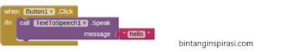 - Lalu Klik TextToSpeech dan pilih call TextToSpeech.speech lalu pasang pada blok button Click me tadi. Seperti gambar dibawah ini.