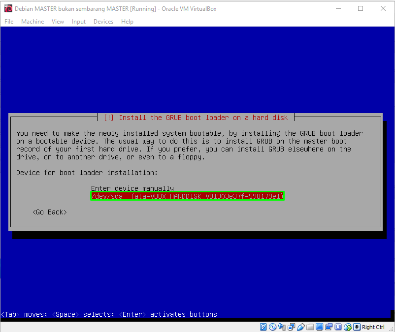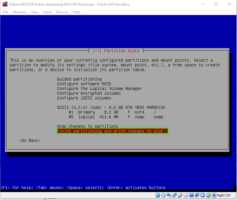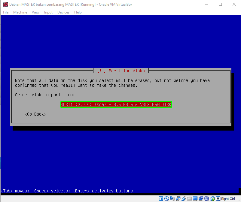 Kemudian pilih SCSI1 (0,0,0) (sda) – 8.6 GB ATA VBOX HARDDISK