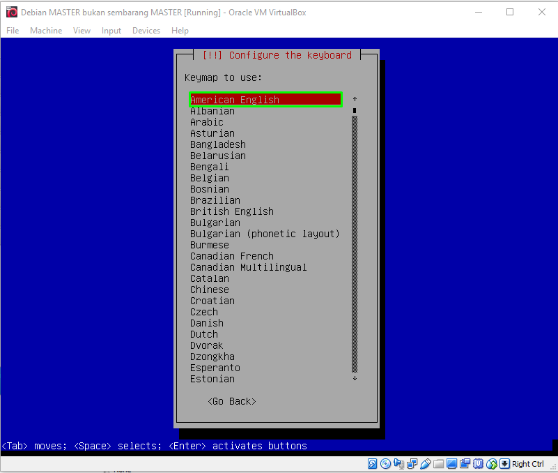 - Selanjutnya pada menu Configure the keyboard pilih American English > Enter