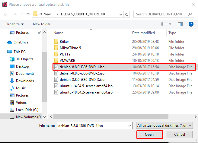 Cari File ISO Debian 8 DVD1 kemudian Open