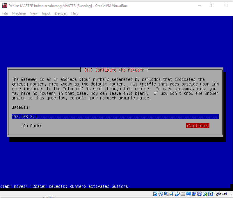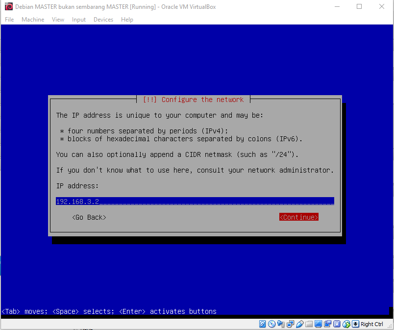 - Selanjutnya pada menu Configure the network, Isikan IP Address (bebas) disini saya menggunakan IP Address 192.168.3.2 > Continue