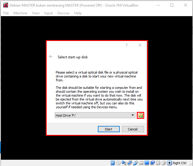 - Jalankan Debian 8 dengan klik Start untuk memulai instalasi – Masukkan File Debian 8 dengan klik Icon Folder