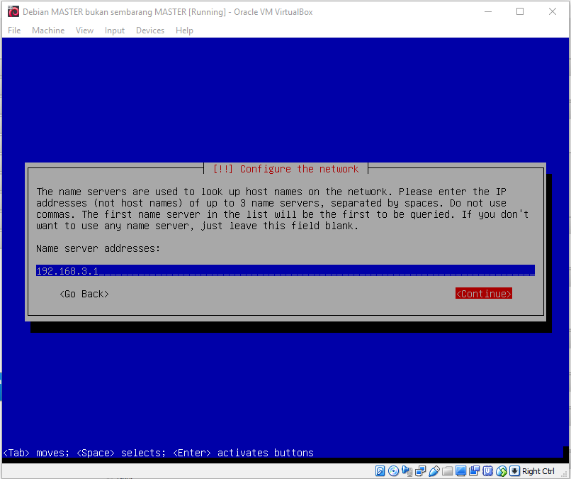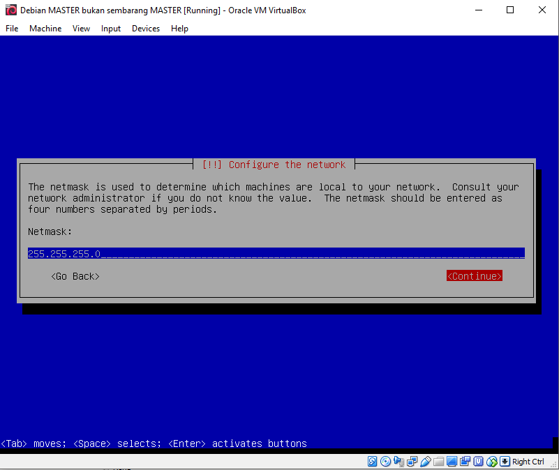 - Untuk Netmask saya menggunakan /24, jadi 255.255.255.0 > Continue