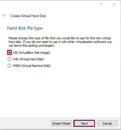 Pada pilihan hard disk file type pilih VDI (Virtualbox Disk Image) > Next