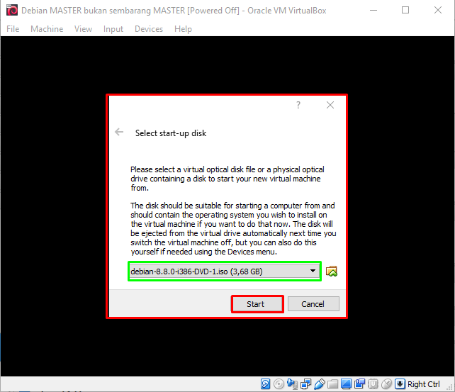 - Tampilan setelah File ISO Debian 8 ditambahkan, selanjutnya klik Start untuk memulai instalasi