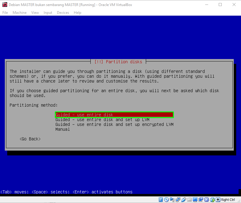 Pada menu Partition Disk, pilih Guided – use entire disk > Enter