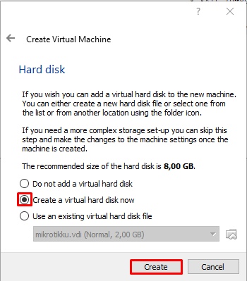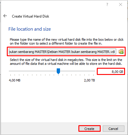 Selanjutnya tentukan lokasi untuk menyimpan file debian, lokasi bebas dengan ukuran 8,00G > Create