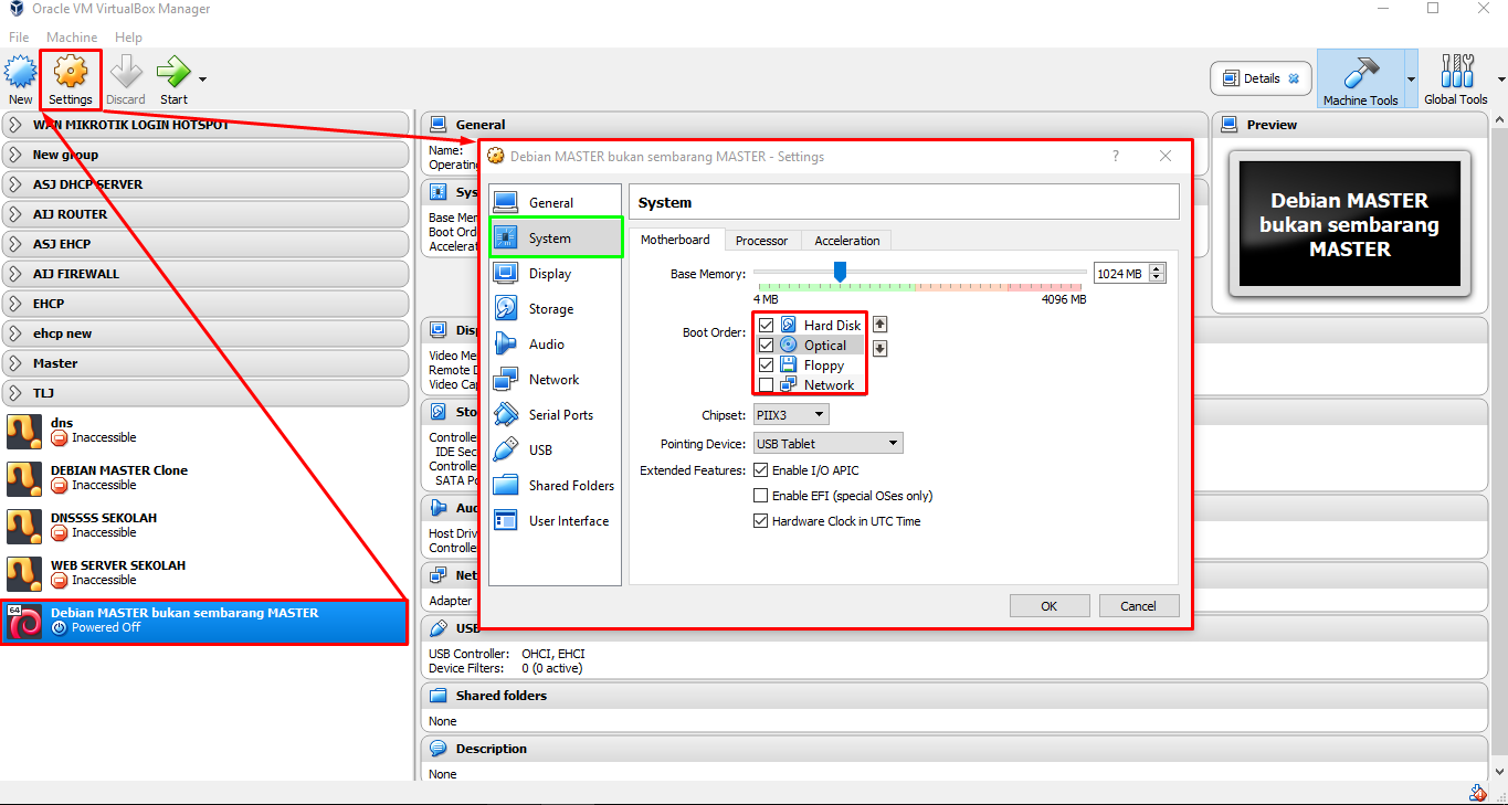 Selanjutnya setting terlebih dahulu debian 8, buka menu Setting > System, Ubah seperti gambar berikut > OK