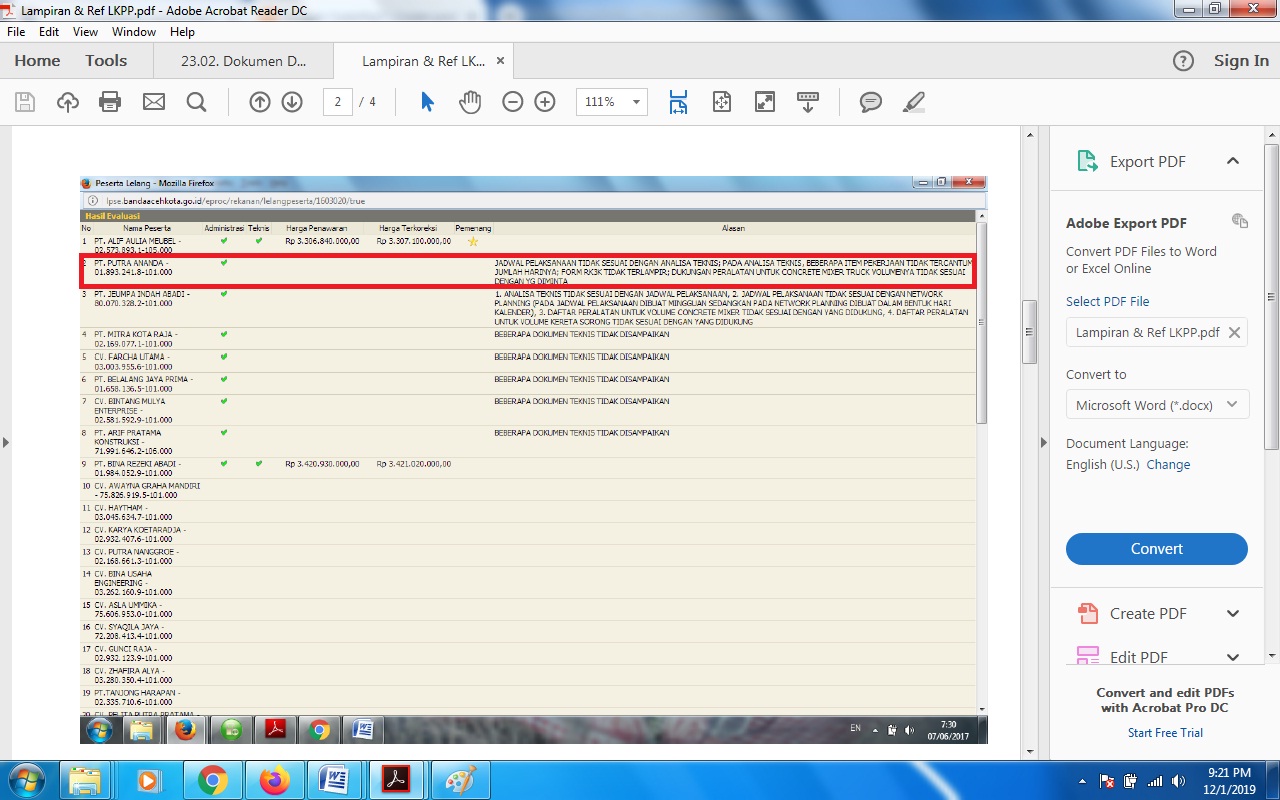 Kami rasa Pokja ULP telah keliru dalam menulis alasan untuk menggugurkan penawaran kami yaitu, “analisa teknis tidak sesuai dengan jadwal pelaksanaan pekerjaan” harusnya jika pokja mengerti alur pembuatan dokumen penawaran maka menulis “Jadwal pelaksanaan pekerjaan tidak sesuai dengan analisa teknis”. Dari alasan pokja ini dapat disimpulkan bahwa pokja tidak professional dalam menjalankan kewenangannya untuk evaluasi teknis penawaran dan tidak mengerti terbukti dengan salah / keliru dalam memberikan alasan yang menggugurkan penawaran kami.