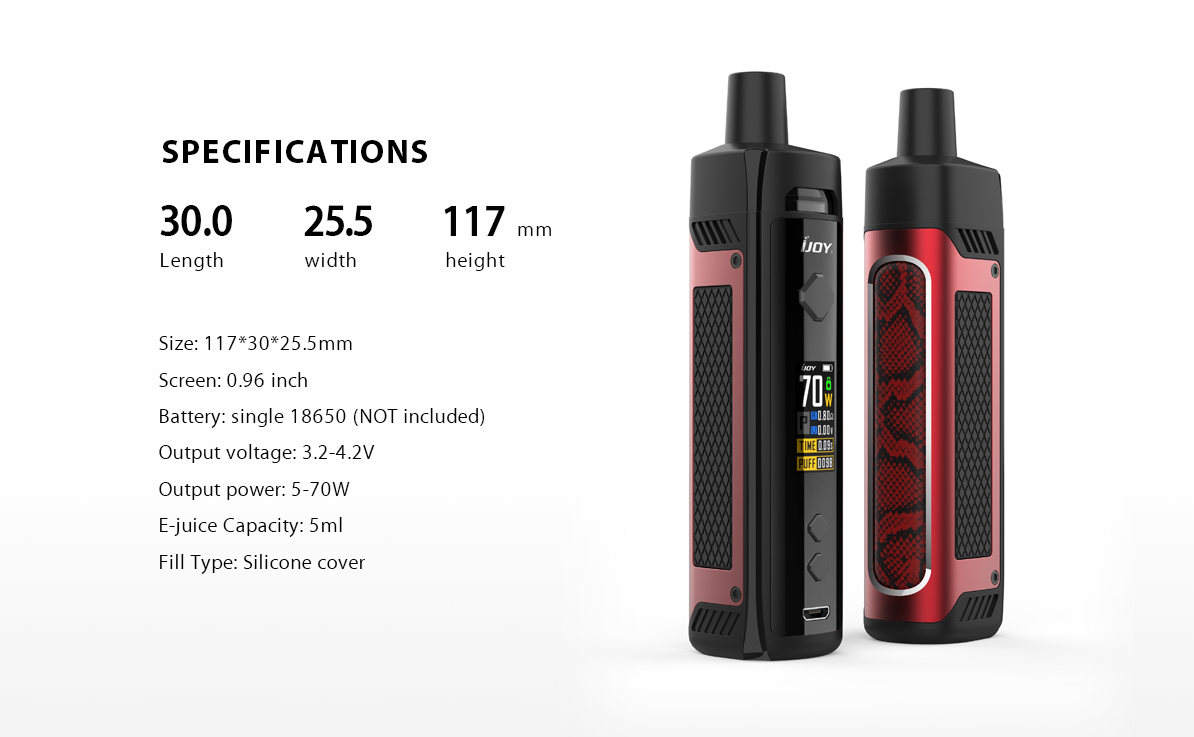 Diadopsi dengan chipset UNIV terdepan, IJOY Jupiter Pod Starter Kit terbuat dari dua bahan logam dan kulit dengan tampilan elegan dan modern. Didukung oleh baterai 18650 tunggal dengan output daya maks 70W, Mod Jupiter mendukung vaping satu hari. Dan ia datang dengan koil mesh J1 0.2ohm dan koil mesh J2 0.6ohm untuk cloud besar dan rasa optimal. Ditambah layar warna TFT 0,96 inci dan versi 8 warna, Just JOY Jupiter akan memberi Anda vaping yang hebat!