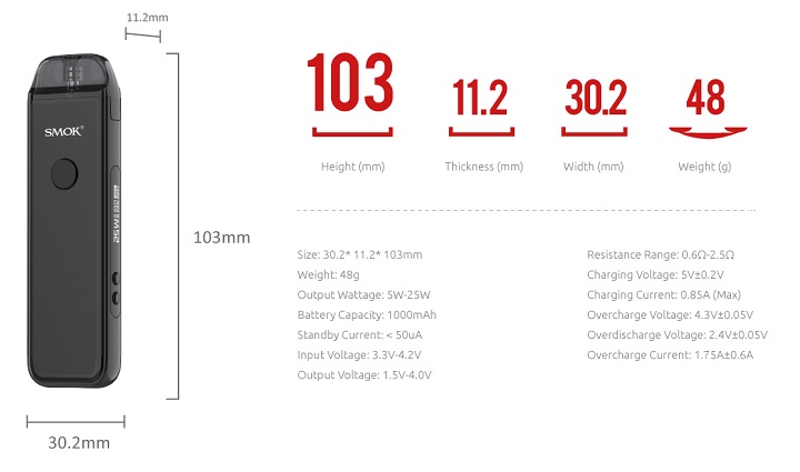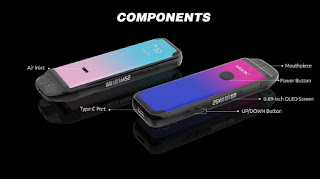 Perangkat Smok Pod mengadopsi satu layar OLED 0,69 inci, yang akan menampilkan data vaping dengan jelas. ada satu sakelar yang dapat disesuaikan aliran udara di bagian tengah.